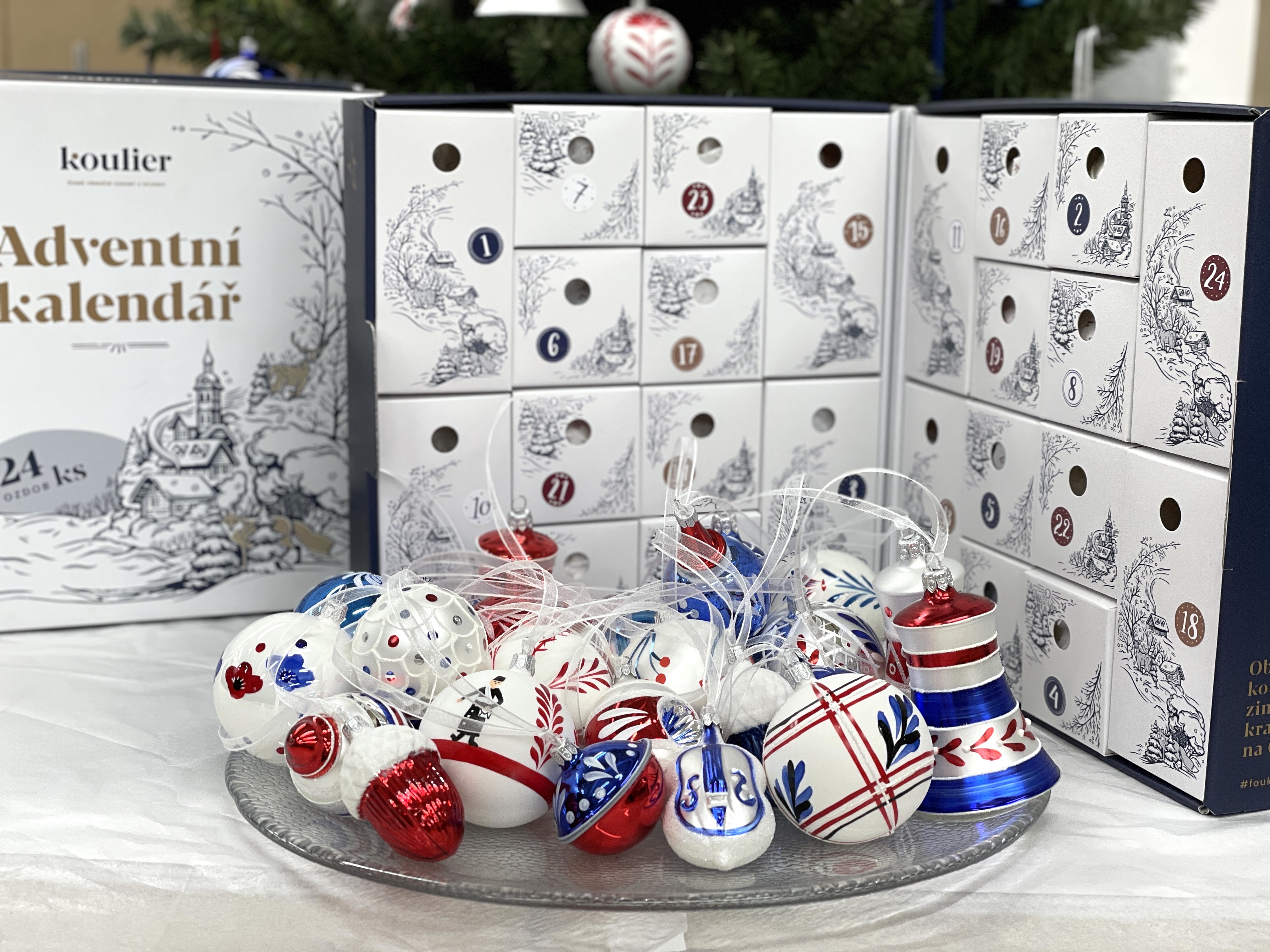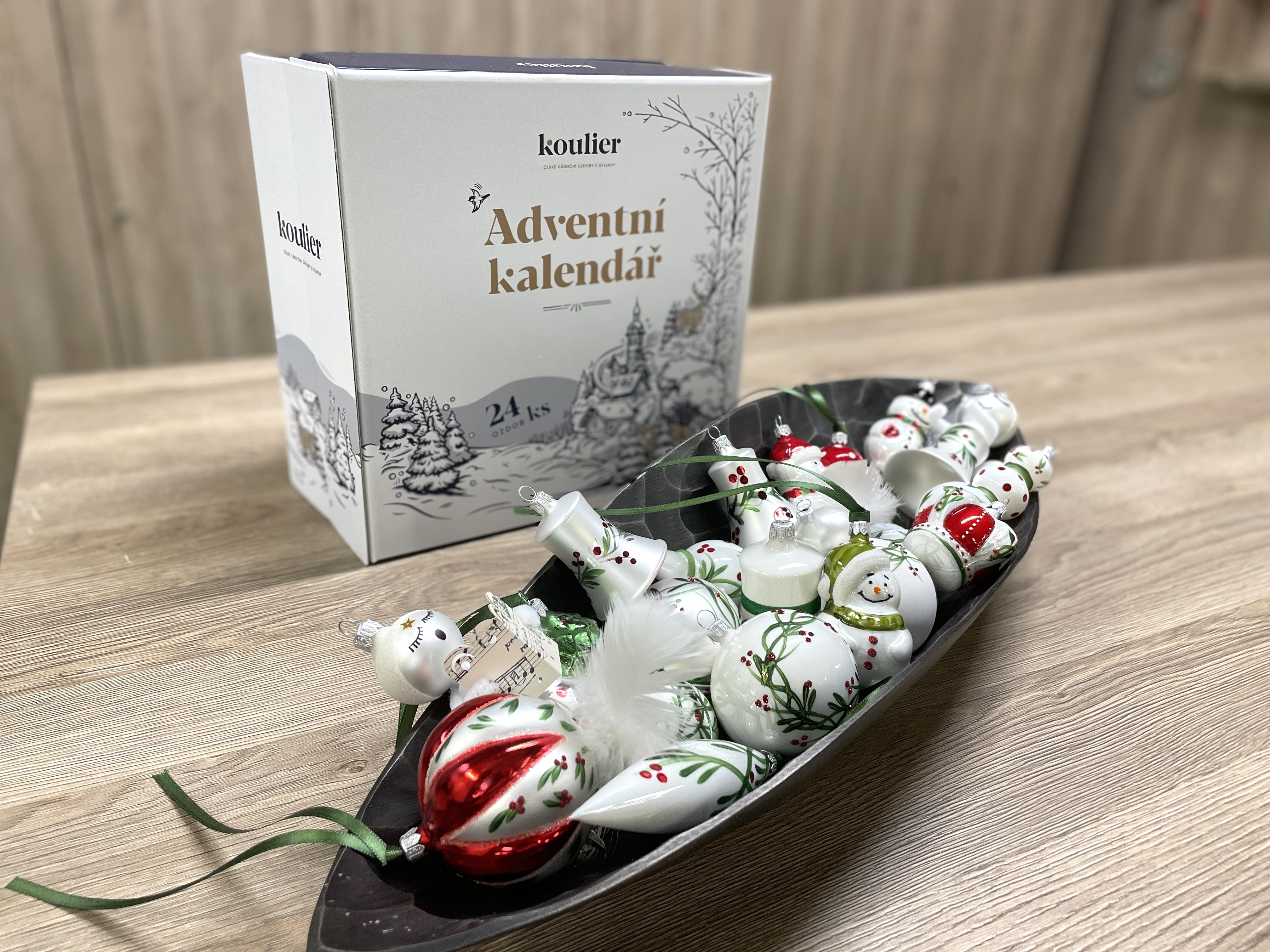 V Koulieru jsme jako první v Česku vytvořili adventní kalendáře s ručně foukanými ozdobami – každý den adventu odhalíte originální kouličku nebo figurku, kterou můžete rovnou pověsit na stromeček. Ozdoby jsou uloženy v elegantním boxu se 24 krabičkami a po Vánocích je snadno uložíte zpět, takže kalendář slouží i jako praktické balení na další roky nebo originální dárek. Letošní novinkou je kalendář Domovina s výběrem ozdob ze stejnojmenné kolekce. Vybrat si můžete také náš první Velký adventní kalendář nebo jemně laděný Bílozlatý či Cesmínový.