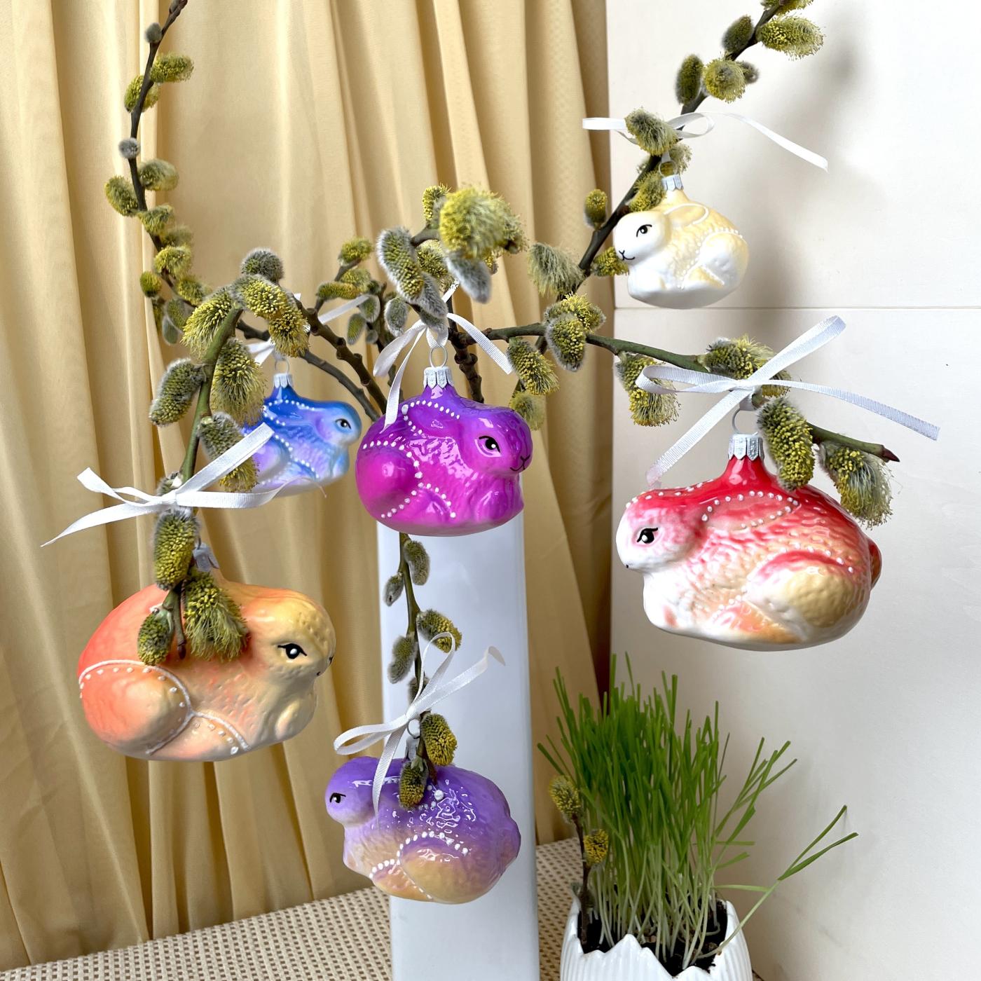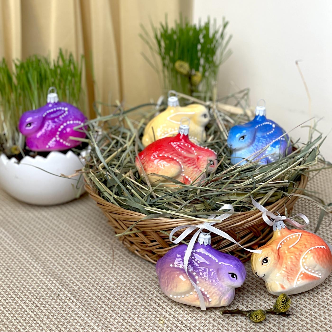 Jarní sada 6 ks skleněných zajíčků buclatých (6 x 8 cm).