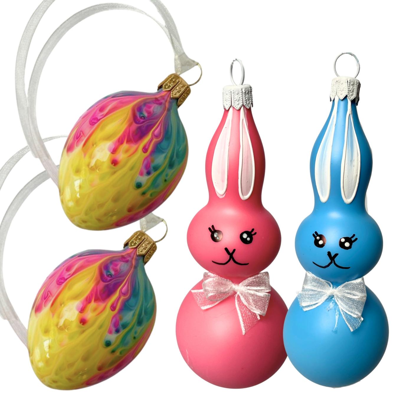 Skleněné ozdoby - Jarní komplet Zajíčci s duhovými vajíčky, 4 ks