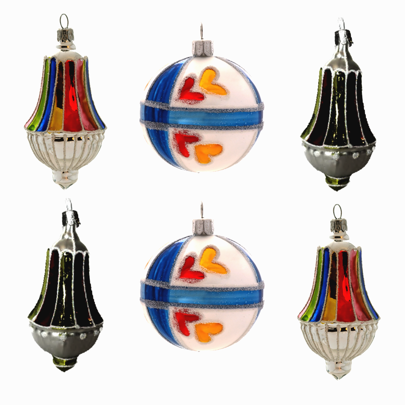 Skleněné vánoční ozdoby Retro - Koule se srdíčky a lampiony, 6 ks - popis: