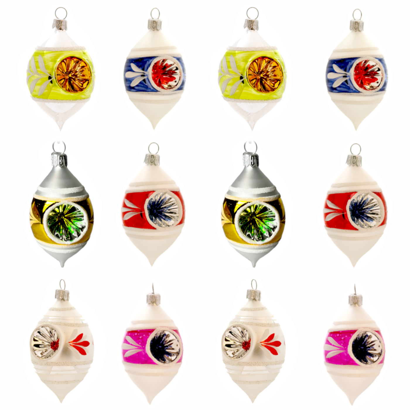 Kolekce Retro vznikla podle stejných archivních podkladů jako Domovina, ale nabízí pestřejší a hravější podobu prvních českých skleněných ozdob. Na tradičním bílém základu vynikají sytější barvy – růžová, zelená, žlutá i tóny modré a červené. Retro kolekce potěší všechny, kdo milují hravost a nostalgii, a zároveň se skvěle kombinuje s jednobarevnými ozdobami z kolekce Basic.